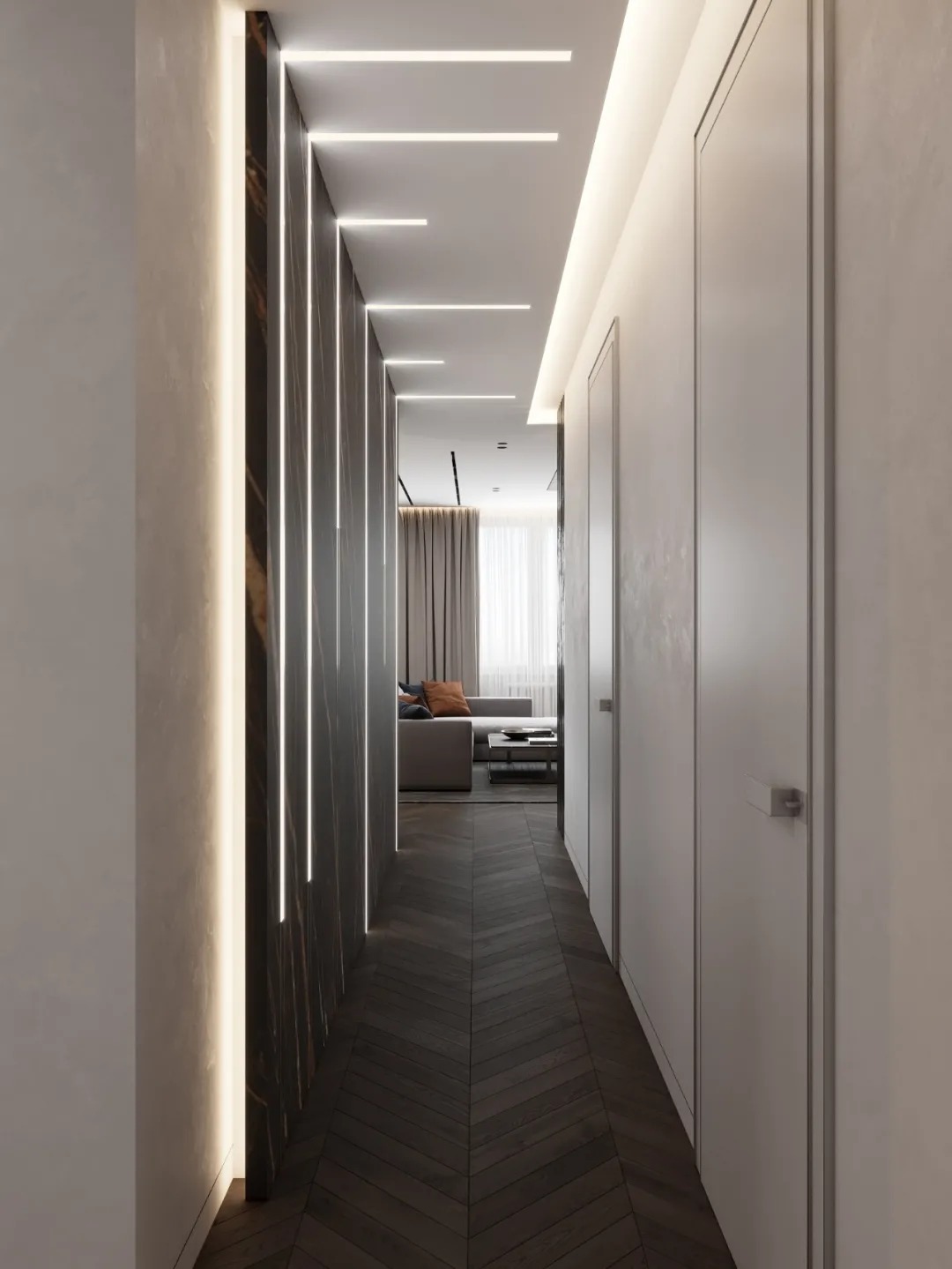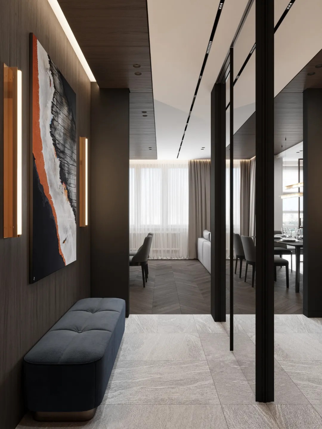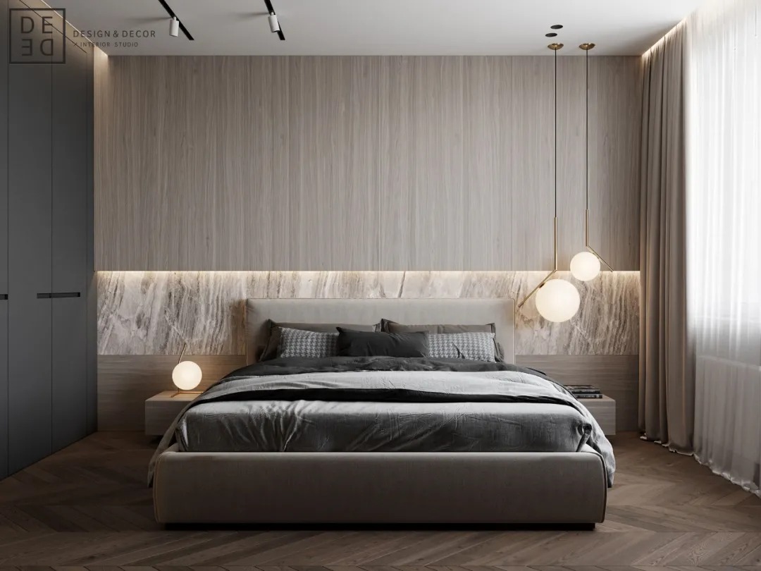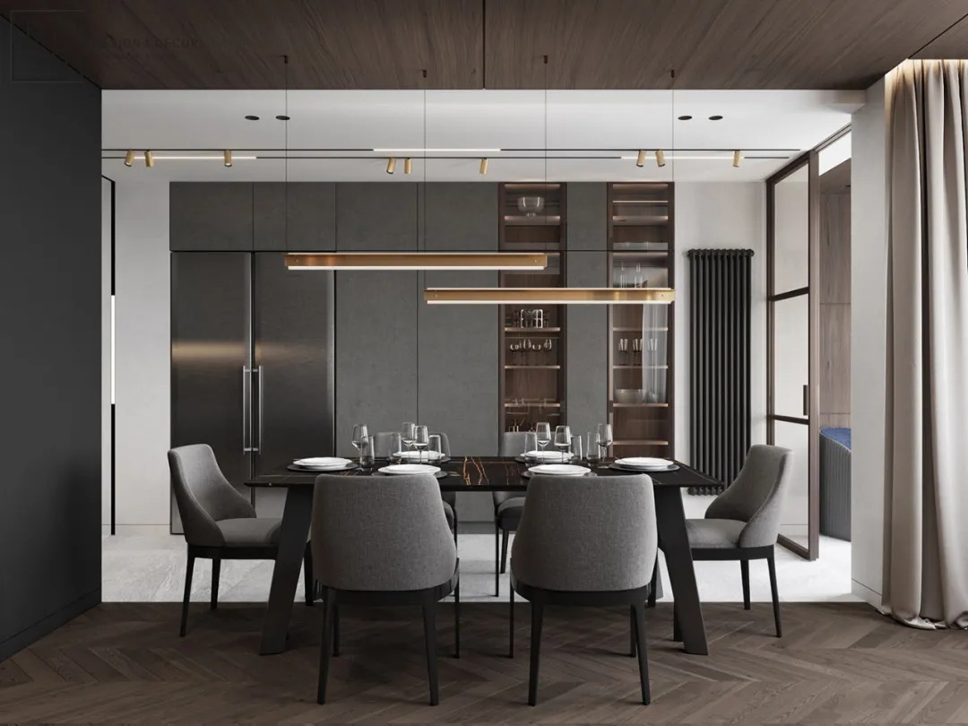总面积为130平方米。室内以深灰、浅灰、蓝色穿插交错于整个空间,加入石材与胡桃木多重材质碰撞打造出沉静现代的魅力空间。空间部分灯饰采用藏于墙内的细长灯带,散发闪耀温暖的光线精致了空间的硬朗线条,让空间看起来有着不一样的奢华高级感。小小的阳台部分也被设计得高级舒适,简约不带一条多余的线条与装饰,全包式的玻璃窗引入充足的光线,木板从天花顶垂落的墙面,静谧惬意的感觉被呈现于阳台空间。
