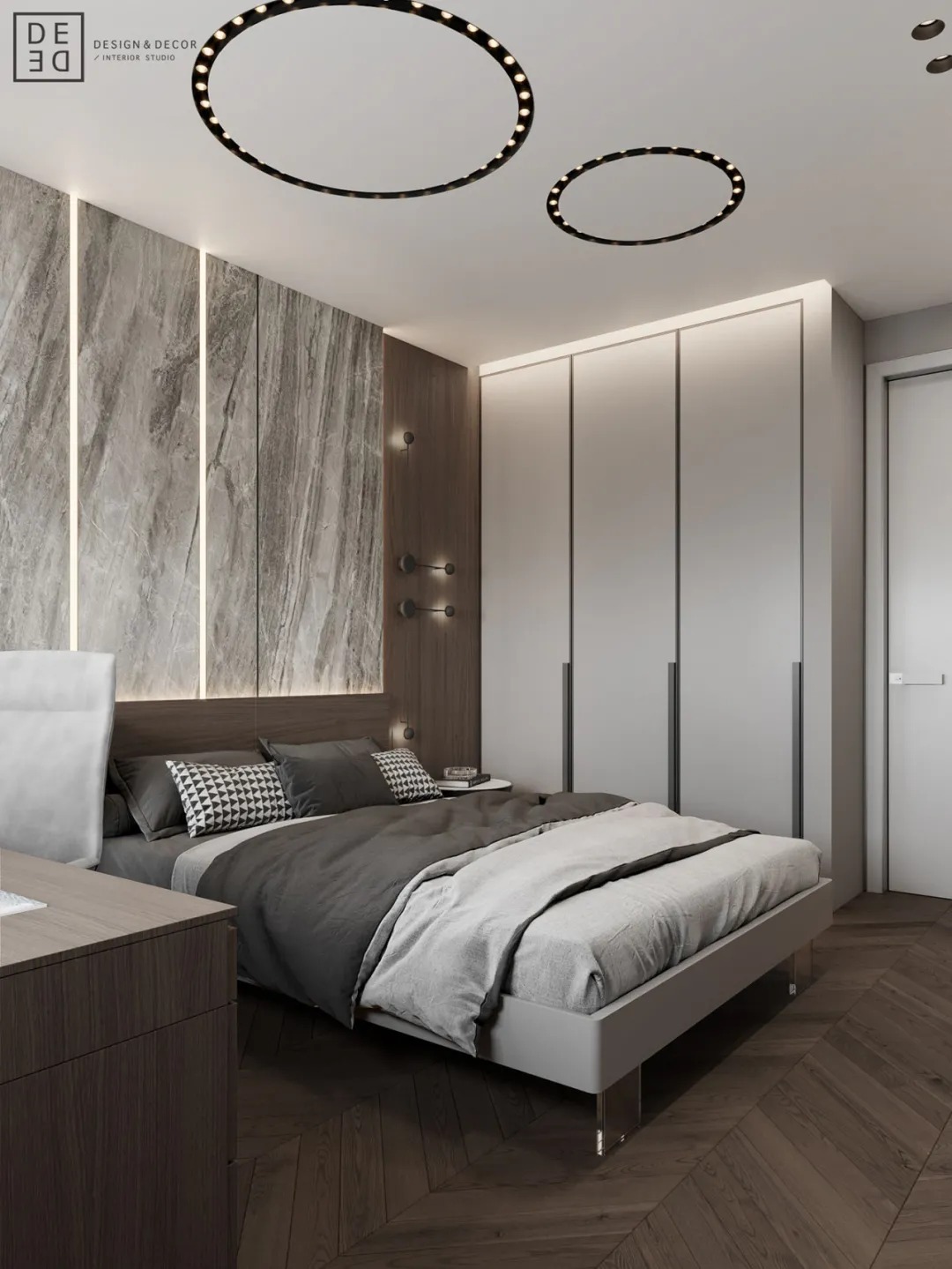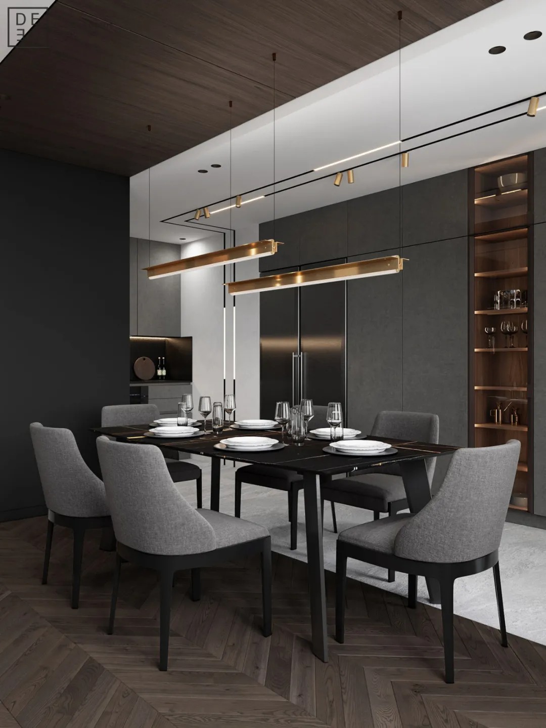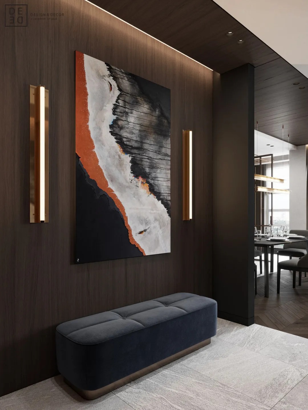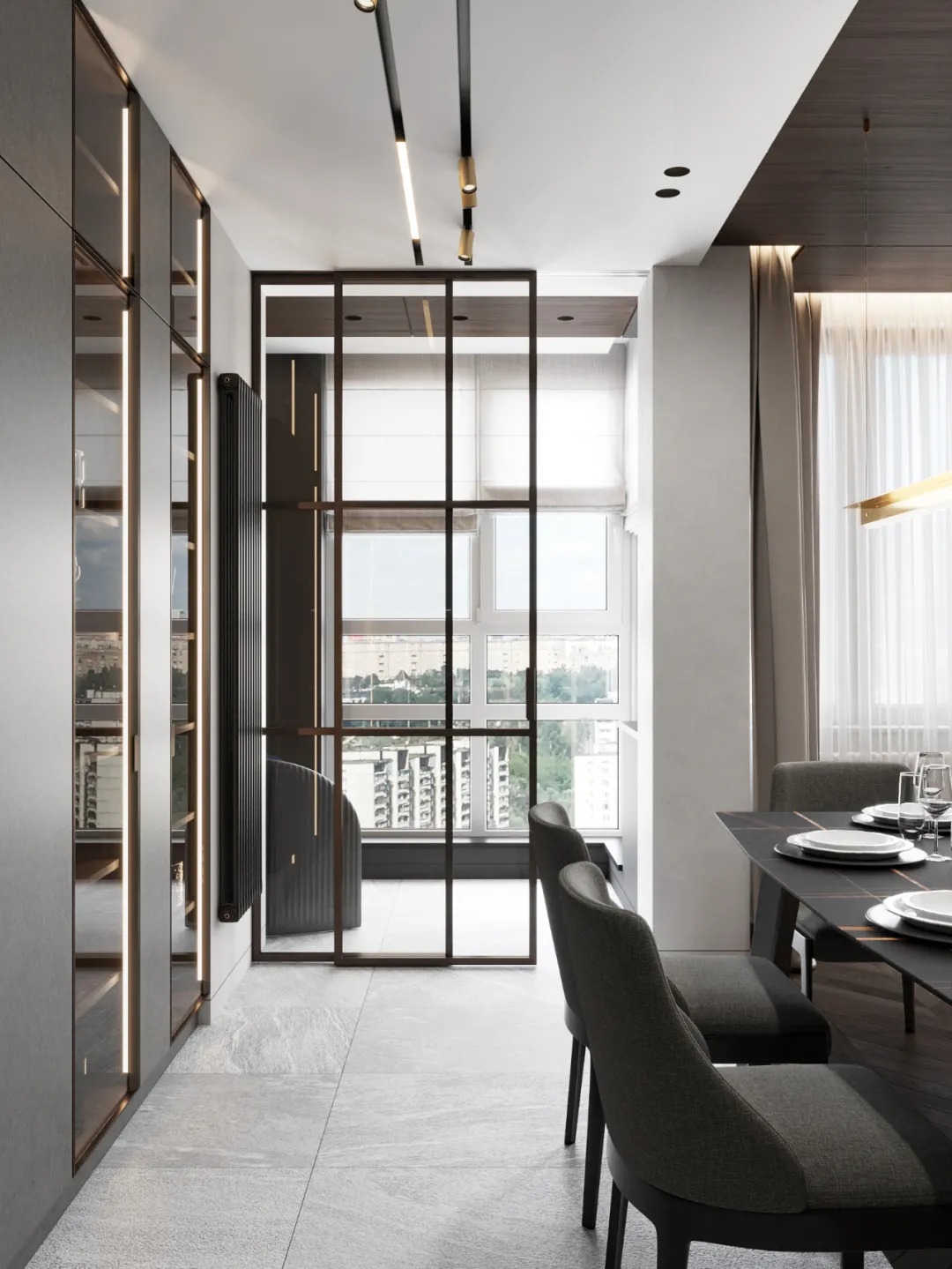 总面积为130平方米。室内以深灰、浅灰、蓝色穿插交错于整个空间,加入石材与胡桃木多重材质碰撞打造出沉静现代的魅力空间。空间部分灯饰采用藏于墙内的细长灯带,散发闪耀温暖的光线精致了空间的硬朗线条,让空间看起来有着不一样的奢华高级感。小小的阳台部分也被设计得高级舒适,简约不带一条多余的线条与装饰,全包式的玻璃窗引入充足的光线,木板从天花顶垂落的墙面,静谧惬意的感觉被呈现于阳台空间。