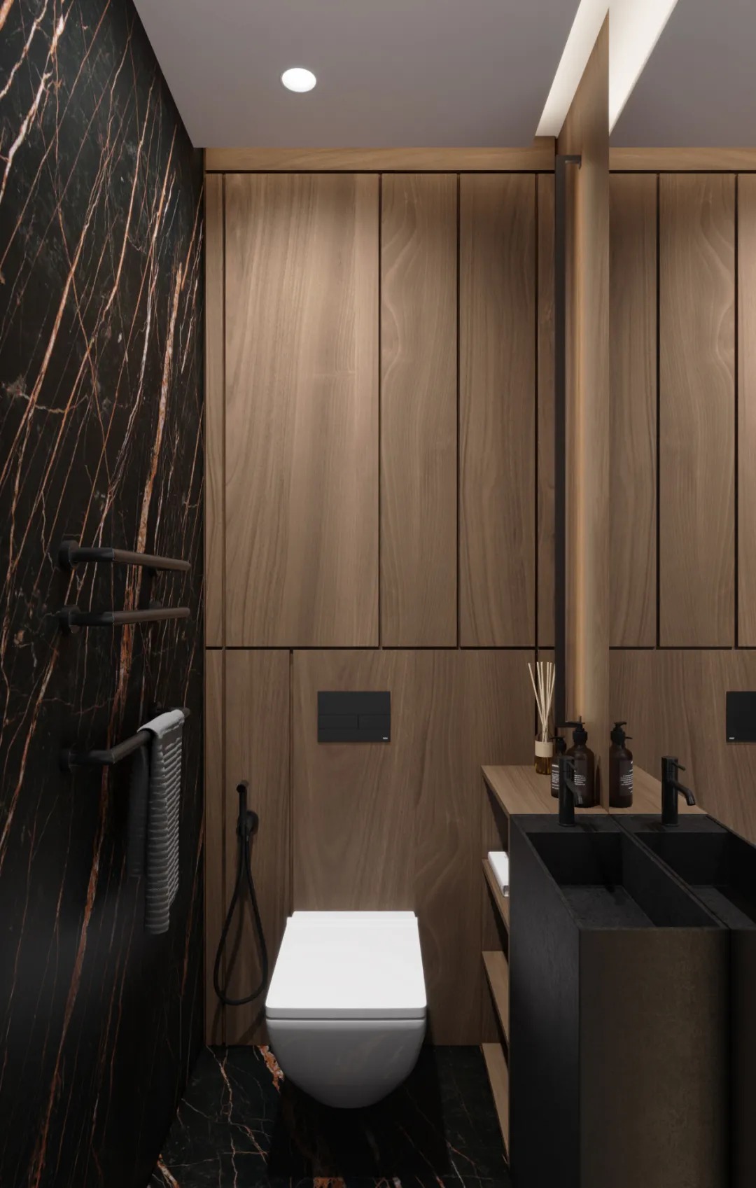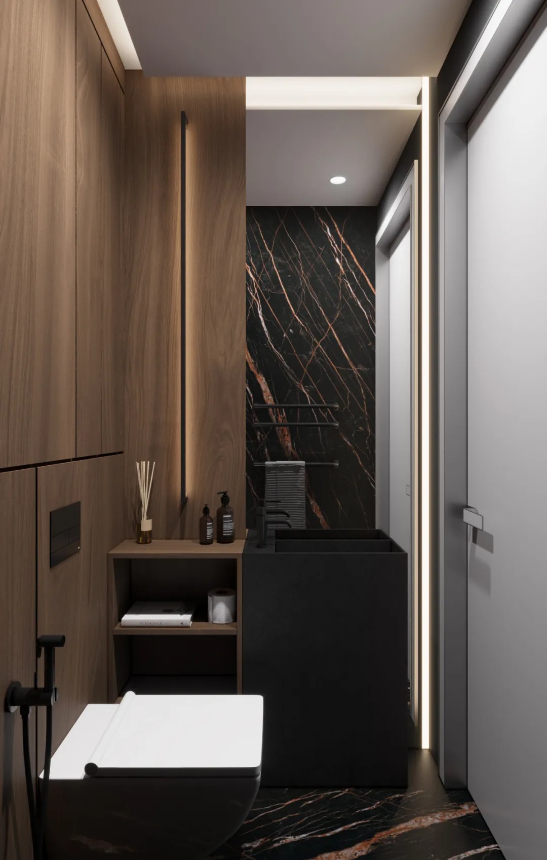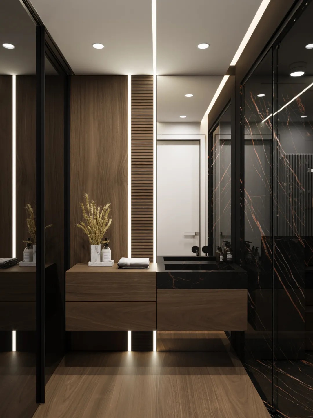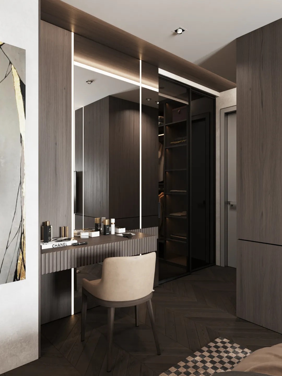 总面积为130平方米。室内以深灰、浅灰、蓝色穿插交错于整个空间,加入石材与胡桃木多重材质碰撞打造出沉静现代的魅力空间。空间部分灯饰采用藏于墙内的细长灯带,散发闪耀温暖的光线精致了空间的硬朗线条,让空间看起来有着不一样的奢华高级感。小小的阳台部分也被设计得高级舒适,简约不带一条多余的线条与装饰,全包式的玻璃窗引入充足的光线,木板从天花顶垂落的墙面,静谧惬意的感觉被呈现于阳台空间。